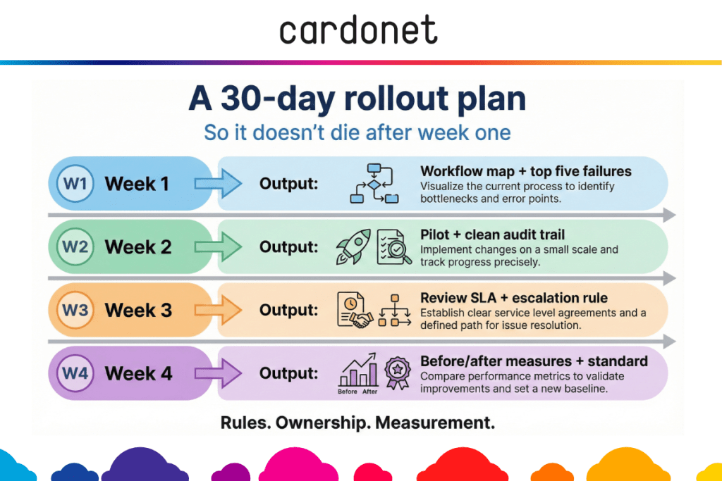 Week 4: Measure and scale. Output is a before/after table for the pilot showing approval cycle time, rework hours, and meeting hours, plus an agreed standard way of working.