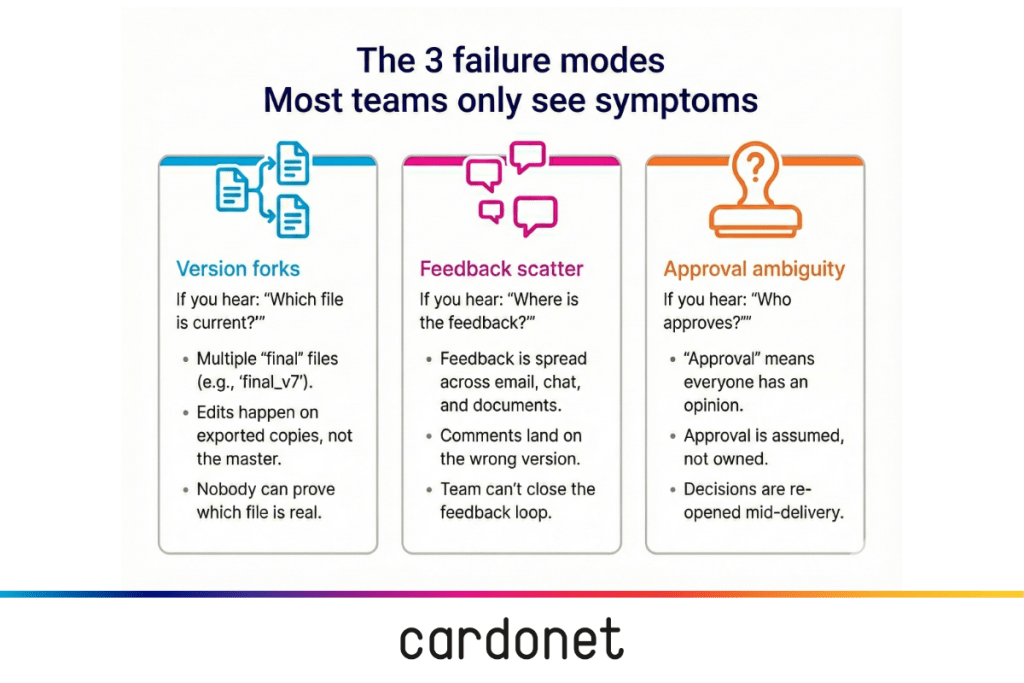 Version chaos has a predictable pattern: someone exports a copy “just to be safe”, edits happen in parallel, feedback lands on the wrong version, and the team spends hours reconciling changes under deadline pressure.