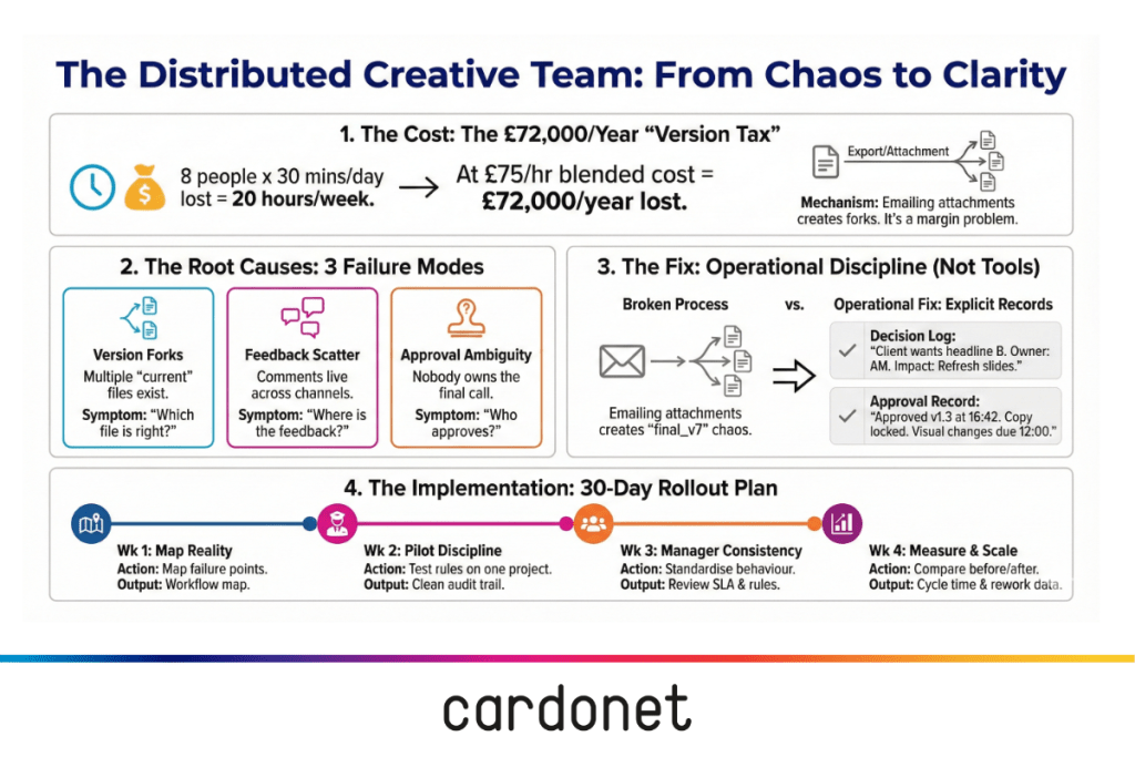 Quick maths. If eight people lose 30 minutes a day to version chasing, duplicate edits, and feedback hunting. That’s 20 hours a week. At a £75/hour blended internal cost, that’s £1,500 a week, roughly £6,000 a month, and around £72,000 a year. Swap in your headcount and blended cost and you’ll get your number in 30 seconds.